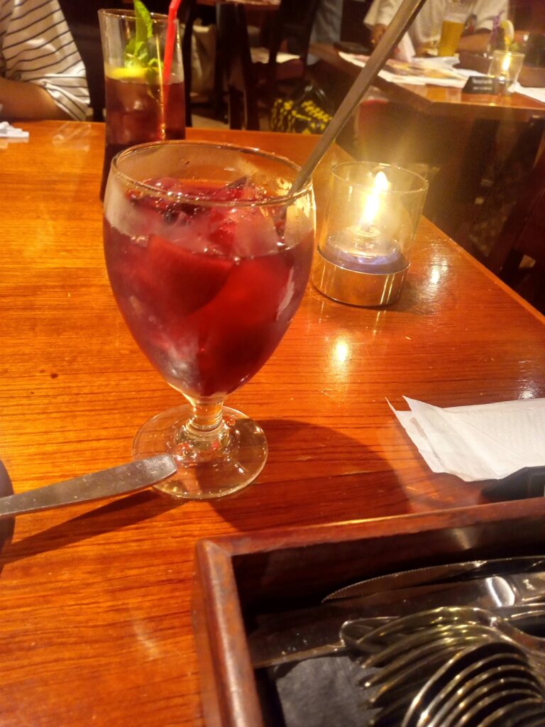 やることが決まったら、8月12日の夜は早めに寝ることにしました。予想外のトラブルにショックを受け(気持ちはブルー(>_<))すっかり疲れてしまったし、翌日やることが沢山あるから(気持ちが重苦しいとはこの事だ!)美味しいご飯を食べて今日は体を休めよう!この日は、ホテル近くのお店でお酒とご飯を頂きました。オシャレな雰囲気のお店でパスタとピザ、グラタンか何かも食べました。写真はカクテル。美味しかったよ。心配ごとはありつつも楽しむ所はしっかり楽しめました。
